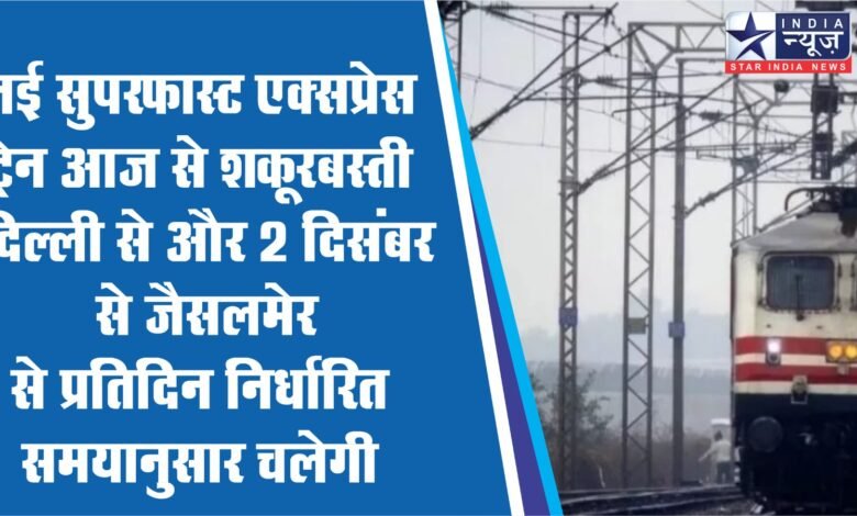 स्टार इंडिया न्यूज प्रतिनिधि, जोधपुर। शकूरबस्ती दिल्ली-जैसलमेर वाया जयपुर होकर स्वर्ण नगरी सुपरफास्ट एक्सप्रेस का नियमित संचालन आज से शुरू हो रहा है। यह नई सुपरफास्ट एक्सप्रेस ट्रेन आज से शकूरबस्ती दिल्ली से और 2 दिसंबर से जैसलमेर से प्रतिदिन निर्धारित समयानुसार चलेगी। जैसलमेर से यह ट्रेन नियमित रूप से शाम 5 बजे रवाना होकर रात 9:50 बजे जोधपुर और तड़के 3:20 बजे जयपुर पहुंचेगी। यहां 10 मिनट के ठहराव के बाद यह सुबह 9:30 बजे शकूरबस्ती (दिल्ली) पहुंचेगी रेलमंत्री अश्विनी वैष्णव ने 29 नवंबर को जैसलमेर रेलवे स्टेशन से जैसलमेर-शकूरबस्ती दिल्ली सुपरफास्ट स्पेशल उद्घाटन ट्रेन को हरी झंडी दिखाकर रवाना किया था। इस अवसर पर रेलमंत्री वैष्णव ने ट्रेन का नया नाम स्वर्ण नगरी सुपरफास्ट एक्सप्रेस रखा था। दिल्ली रूट पर अब जयपुर से यात्रियों को कुल 16 ट्रेनें उपलब्ध हो गई हैं। स्वर्ण नगरी स्पेशल सुपरफास्ट एक्सप्रेस रेलसेवा में 01 फर्स्ट एसी, 01 सैकण्ड एसी, 02 थर्ड एसी, 06 द्वितीय शयनयान, 04 साधारण श्रेणी, 01 गार्ड डिब्बा व 01 पावरकार सहित कुल 16 डिब्बे एलएचबी कोच लगाए गए हैं।स्वर्ण नगरी स्पेशल सुपरफास्ट ट्रेन का दिल्ली कैंट, गुड़गांव, रेवाड़ी, अलवर, दौसा, जयपुर, फुलेरा, नावां सिटी, कुचामन सिटी, मकराना, डेगाना, मेड़ता रोड, जोधपुर, ओसियां, मारवाड़ लोहावट, फलोदी, रामदेवरा और आशापुरा गोमट स्टेशनों पर ठहराव होगा।