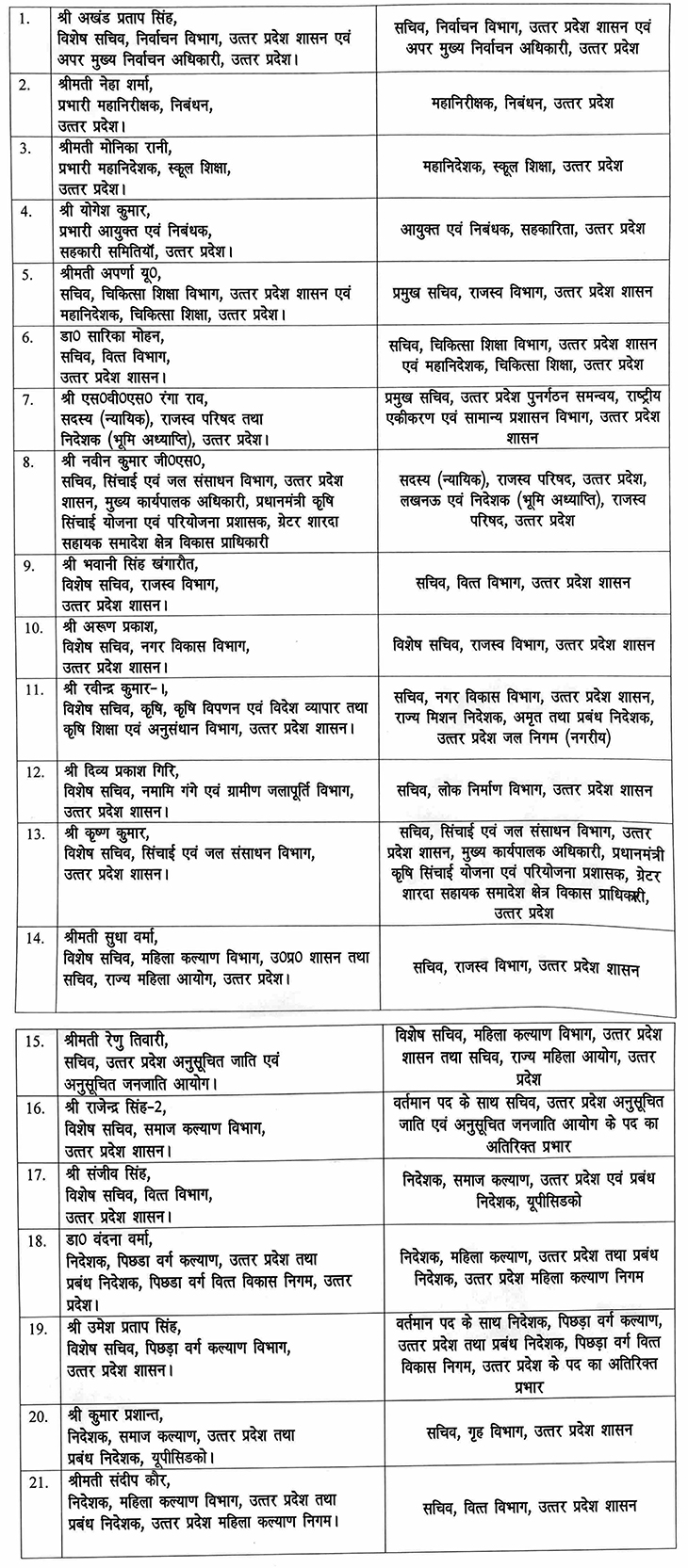 अपर्णा यू को प्रमुख सचिव राजस्व, एसवीएस रंगाराव को प्रमुख सचिव उत्तर प्रदेश पुनर्गठन समन्वय राष्ट्रीय एकीकरण तथा सामान्य प्रशासन बनाया है। इसके अलावा अखंड प्रताप सिंह विशेष सचिव निर्वाचन से उसी विभाग में सचिव बनाए गए हैं।