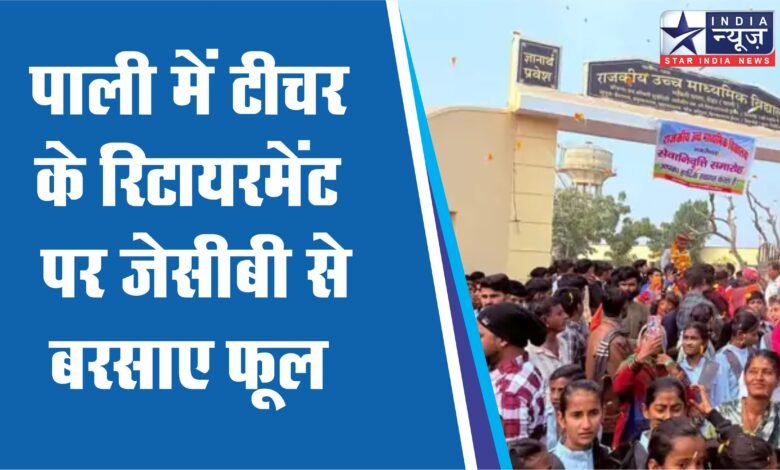 पाली में एक शिक्षक के रिटायरमेंट के दिन को उनके स्टूडेंट्स और गांव वालों ने यादगार बना दिया। स्कूल से 9 किलोमीटर दूर टीचर के घर तक घोड़े पर उनकी बिंदौरी निकाली। JCB पर खड़े होकर टीचर पर फूल बरसाए गए। विदाई में सोने की अंगूठी और 11 हजार कैश भी दिया।