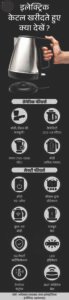 जवाब- इलेक्ट्रिक केटल खरीदते समय उसकी कैपेसिटी, मटेरियल, सेफ्टी फीचर्स, पावर, वाट और कीमत पर समेत कुछ बातों का ध्यान रखना चाहिए। इसे नीचे दिए ग्राफिक से समझिए-
