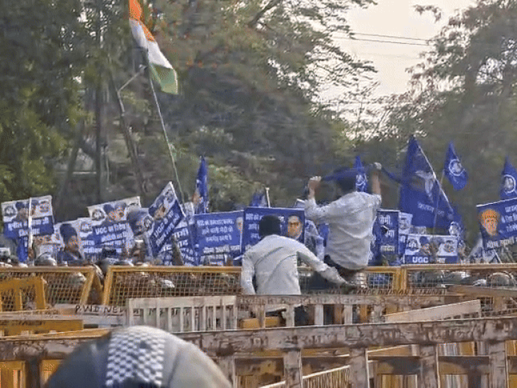 यूजीसी के समर्थन में भीम आर्मी-ASP का प्रदर्शन:पूर्व विधायक ने धीरेन्द्र शास्त्री की तुलना डकैतों से की, कहा- दान लाखों कन्याओं के नाम पर, शादियां कुछ सौ की