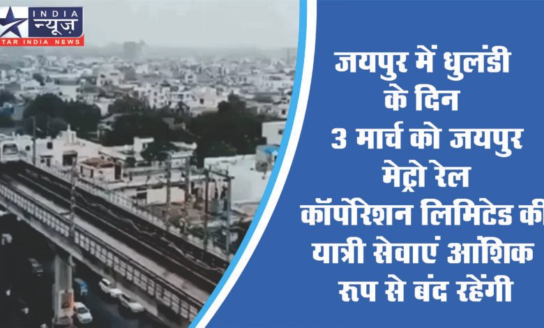 जयपुर में धुलंडी के दिन 3 मार्च को जयपुर मेट्रो रेल कॉर्पोरेशन लिमिटेड की यात्री सेवाएं आंशिक रूप से बंद रहेंगी