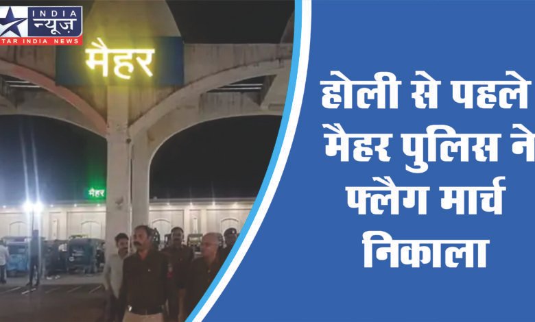 होली से पहले मैहर पुलिस ने फ्लैग मार्च निकाला:हुड़दंगियों पर रहेगी नजर और डीजे संचालकों को समय-सीमा का पालन करना होगा