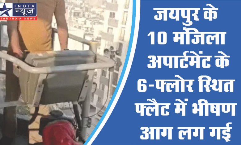 जयपुर के 10 मंजिला अपार्टमेंट के 6-फ्लोर स्थित फ्लैट में मंगलवार सुबह भीषण आग लग गई। श्याम नगर थाना पुलिस ने रजिडेंसी गार्ड्स की मदद से रेस्क्यू ऑपरेशन चलाकर बिल्डिंग को खाली करवायाा। जान बचाने के लिए छत पर पहुंचने से फंसे दो परिवार को हाइड्रोलिक फायर बिग्रेड की मदद से नीचे उतारा गया।