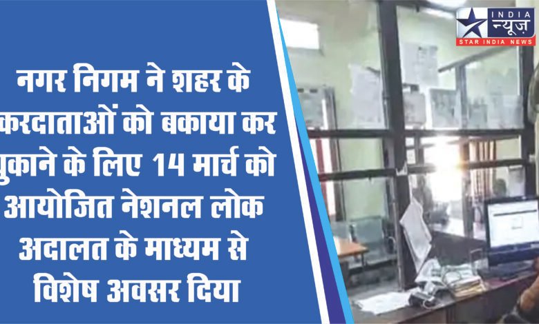 नगर निगम ने शहर के करदाताओं को बकाया कर चुकाने के लिए 14 मार्च को आयोजित नेशनल लोक अदालत के माध्यम से विशेष अवसर दिया