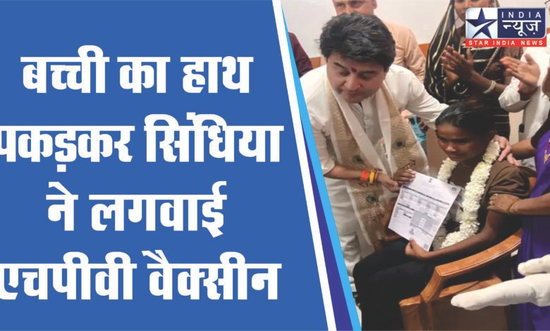बच्ची का हाथ पकड़कर सिंधिया ने लगवाई एचपीवी वैक्सीन:गुना के म्याना अस्पताल में बोले- कुछ नहीं होगा, मैं रोज इंजेक्शन लगवाता
