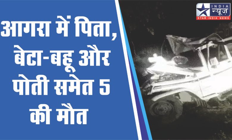 आगरा में श्रद्धालुओं से भरी बोलेरो कार पेड़ से टकरा गई। हादसे में एक ही परिवार के 5 लोगों की मौत हो गई। मरने वालों में पिता, बेटा, बहू, पोती और नाती शामिल हैं। तीन लोग घायल हैं। हादसे के बाद गांव वालों ने गाड़ी के शीशे तोड़कर सभी को बाहर निकाला।