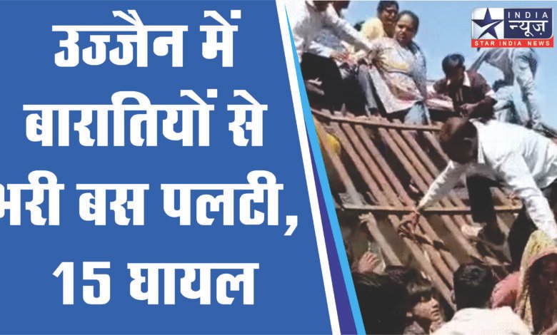 उज्जैन में बारातियों से भरी बस पलटी, 15 घायल:सड़क निर्माण के बीच ओवरटेक करने से हादसा, इंदौर से खाचरोद जा रही थी