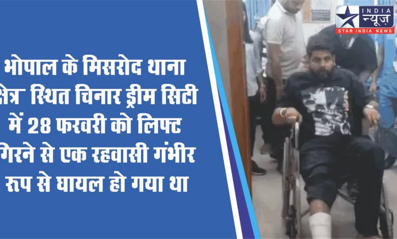 भोपाल के मिसरोद थाना क्षेत्र स्थित चिनार ड्रीम सिटी में 28 फरवरी को लिफ्ट गिरने से एक रहवासी गंभीर रूप से घायल हो गया था