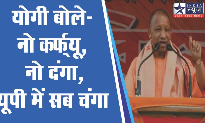 अब यूपी में कर्फ्यू नहीं लगता। नो कर्फ्यू, नो दंगा, यूपी में सब चंगा। सड़क पर कोई नमाज नहीं पढ़ सकता है। किसी धर्म से चिल्लाने की आवाज नहीं आती है। अगर किसी ने दंगा करने का दुस्साहस किया तो उसकी संपत्ति जब्त कर गरीबों और दलितों में बांट दी जाती है।’