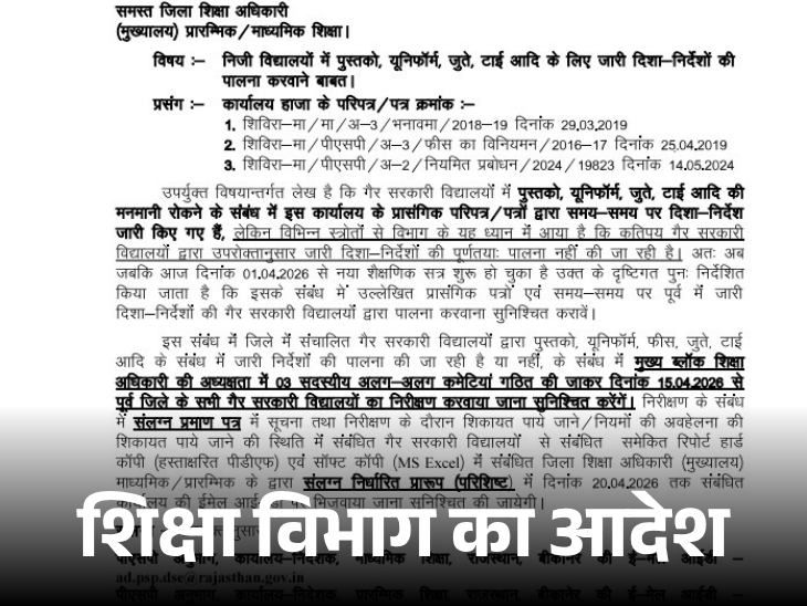 दरअसल, निदेशक की ओर से 1 अप्रैल को जारी आदेशों के अनुसार- गैर सरकारी (प्राइवेट) स्कूलों में स्टूडेंट्स से किताब, यूनिफॉर्म, जूते-टाई आदि के नाम पर लगातार अनियमिताओं की शिकायत मिल रही थी।