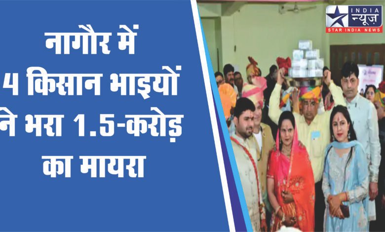 नागौर में 4 किसान भाई अपने भांजे-भांजियों की शादी में 1.5 करोड़ का मायरा लेकर पहुंचे। अपनी इकलौती बहन के 4 बच्चों की शादी में तीनों मामाओं ने मिलकर ये मायरा भरा।