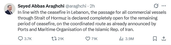 ईरान के विदेश मंत्री सैयद अब्बास अराघची ने सोशल मीडिया प्लेटफॉर्म X पर जानकारी दी कि इजराइल और लेबनान के बीच युद्धविराम के मद्देनजर होर्मुज रूट को सभी व्यापारिक जहाजों के लिए पूरी तरह खोल दिया गया है। मिडिल ईस्ट में तनाव कम होने की उम्मीद से निवेशकों का भरोसा बढ़ा है।