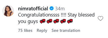 इस पोस्ट पर कई सेलिब्रिटीज ने रिएक्ट किया। एक्ट्रेस निमरत कौर ने लिखा, ‘बधाई हो, आप दोनों खुश रहें।’