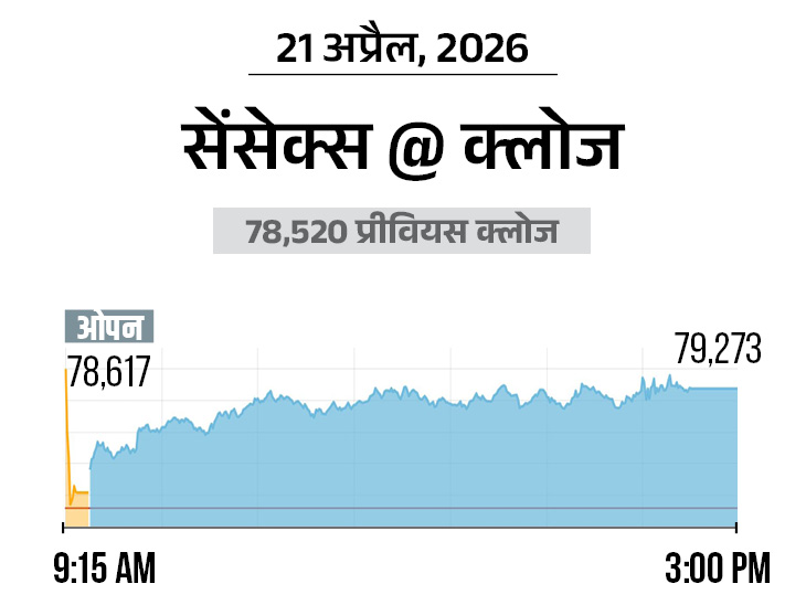 सेंसेक्स आज यानी मंगलवार, 21 अप्रैल को 753 अंक (0.96%) की तेजी के साथ 79,273 पर बंद हुआ। निफ्टी में भी 212 अंकों (0.87%) की तेजी रही, ये 24,577 पर पहुंच गया। आज के कारोबार में निफ्टी FMCG और रियल्टी शेयरों में खरीदारी रही, जबकि फार्मा में सबसे ज्यादा बिकवाली देखी गई।